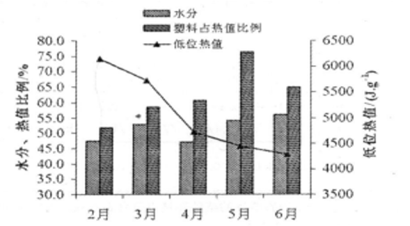 由于我国目前新鲜生活垃圾收集并未真正实施分类、并且存在垃圾桶露天敞口放置、垃圾转运站设施差别大等客观条件。因此我国新鲜城市生活垃圾和发达国家相比差别较大。从上海老港填埋厂收集的新鲜生活数据来看,首先,垃圾成分随机波动大,仅看塑料占比,2月份占比最低约50%。5月份占比最高约75%。其次,垃圾含水率随季节波动大,冬季含水率最低可达47 % ,夏季含水率最高可至56 % ,受降雨量影响明显。另外,新鲜生活垃圾的低位热值波动大,冬季热值最高可达6200KJ/kg,夏季热值最低可至4200KJ/kg。