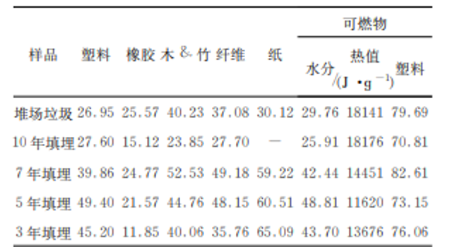 从上海老港生活垃圾填埋场陈旧生活垃圾可以看出以下特点:首先,垃圾填埋3年就已经不含厨余成分,几乎没有臭味。其次,垃圾填埋3年热值可达13000 KJ/kg,填埋10年热值可达17000 KJ/kg。第三,陈旧垃圾挖出后,筛分分选时物料外水会急剧蒸发,无需干燥设备。填埋10年垃圾分选后含水率可从25%下降到15%,是优质替代燃料。