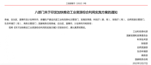 2022 年 1 月 27 日,工信部等八部门印发《关于加快推进工业资源综合利 用的实施方案》,强调要大力推动重点行业工业固废源头减量和规模化高效综合利用,加快推进再生资源高值化循环利用,促进工业资源协同 利用,着力提升工业资源利用效率,促进经济社会发展全面绿色转型。方案 同时提出来了具体措施,比如,鼓励有条件的工业园区和企业创建“无废工 业园区”“无废企业”推动固废在地区内、园区内、厂区内协同循环利用, 提高固废就地资源化效率;加快工业装置协同处置技术升级改造,依托现有 基础,探索形成工业窑炉协同处置固废技术路径及商业模式。