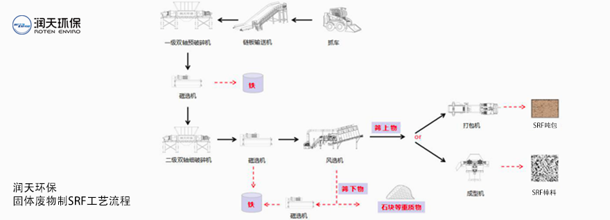 本工艺通过破碎、分选、成型等工序将一般工业固废加工成SRF,作为替代燃料供应水泥、钢铁、发电等高耗能工业。在垃圾能源化的同时促进煤炭替代,节能减排,助力双碳目标,实现工业绿色发展。本工艺满足 12-15t/h 的生产能力,主要用于废旧纺织布条、皮革、塑料 等物料,经过二级破碎后出料粒径 90%≤80mm,偶有长条,经成型机后成 SRF 棒料。